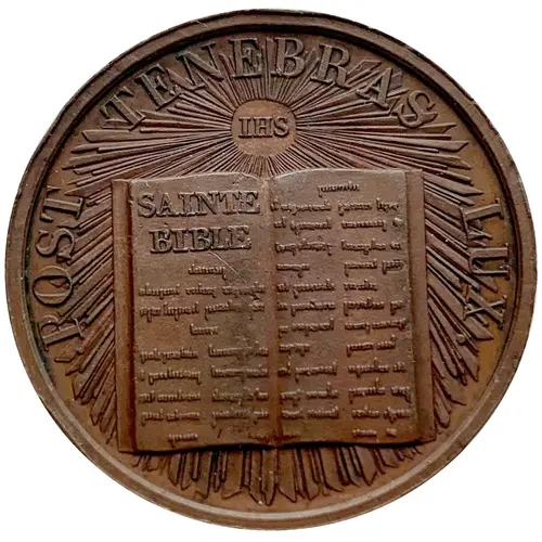 | Obverse lettering | POST TENEBRAS LUX IHS SAINTE BIBLE |