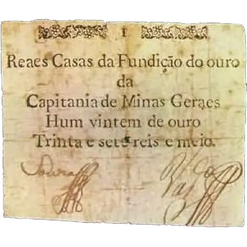 1 Reaes Casas da Fundição do ouro da Capitania de Minas Geraes Hum vintem de ouro Trinta e sete reis e meio. (Translation: 1 Royal Gold Foundry Houses of the Captaincy of Minas Gerais One gold vintém Thirty-seven and a half reis.) |