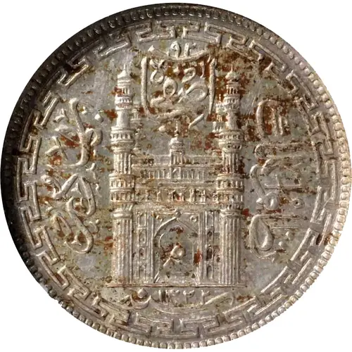 | Obverse description | Charminar gateway in center with writing around stating: Asaf Jah (top) Bahadur (left) Nizam Al-Mulk (right) Mim (Urdu alphabet for `M`, initial of `Mahbub` in the doorway) Date (AH Calender) below Pattern Surrounding all |