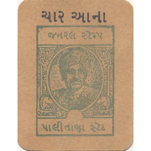 | Beschrijving voorzijde | Green, portrait of Thakor Shri Bahadursinghji at center. Black text at top. |