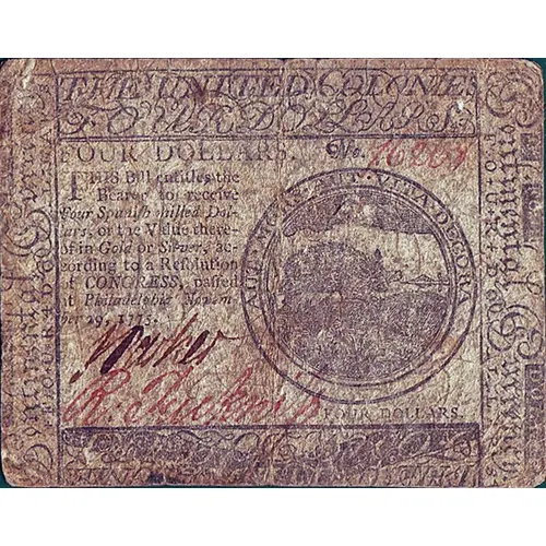 | Obverse lettering | THE UNITED COLONIES FOUR DOLLARS FOUR DOLLARS THIS Bill entitles the Bearer to receive Four Spanish Milled Dol- lars, or the Value there- of, in Gold or Silver, ac- cording to a Resolution of CONGRESS, passed in Philadelphia Novem- ber 29, 1775. CONTINENTAL CURRENCY FOUR DOLLARS |