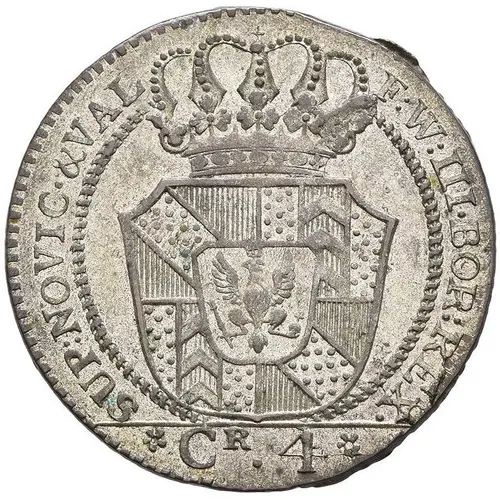F : W : III · BOR : REX · SUP : NOVIC · & VAL C ᴿ · 4 (Translation: Frederick William III, King of Prussia, Sovereign of Neuchâtel and Valangin.) |