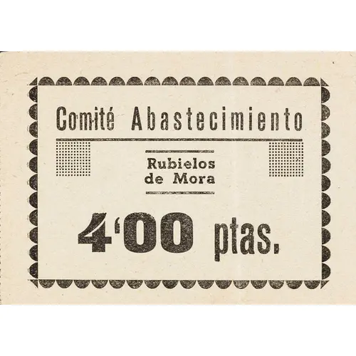 Ön yüz lejandı Comité Abastecimiento Rubielos de Mora 4`00 ptas.