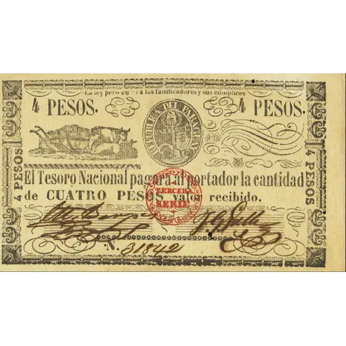 | Obverse lettering | ASUNCION La ley perseguirá á los falsificadores y sus cómplices. 4 PESOS. 4 PESOS. REPUBLICA DEL PARAGUAY El Tesoro Nacional pagará al portador la cantidad de CUATRO PESOS valor recibido. TERCERA SÉRIE (Translation: The law will prosecute counterfeiters and their accomplices. 4 Pesos Republic of Paraguay The National Treasury will pay to the bearer the amount of Four Pesos received value. Third Series) |
