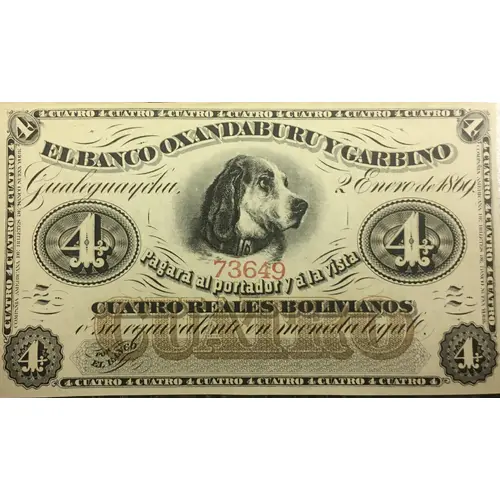 | Legenda awersu | El Banco Oxandaburu y Garbino Gualeguaychu, 2 Enero de 1869. Pagará al portador y á la vista Cuatro Reales Bolivianos ó su equivalente en moneda legal. Por el Banco (Translation: The Oxandaburu and Garbino Bank Gualeguaych, 2 January 1869. Will pay to the bearer on demand Four Bolivian Reales or its equivalent in legal tender. For the Bank) |