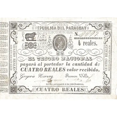 | Legenda del dritto | REPUBLICA DEL PARAGUAY 4 reales. EL TESORO NACIONAL pagará al portador la cantidad de CUATRO REALES valor recebido. La Ley perseguirá á los falsificadores y sos cómplices. CUATRO REALES (Translation: Republic of Paraguay 4 Reales The National Treasury pay to bearer the amount of Four Reales amount received. The Law will prosecute counterfeiters and their accomplices. Four Reales.) |