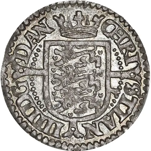| Descripción del anverso | Crowned flat topped Danish arms over long cross within beaded circle. Legend outside divided in four parts by cross arms. |