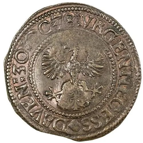 | Obverse lettering | VRGEN ⁑ NECESS DAVEN ⁑ 30 ⁑ OC × 78 |