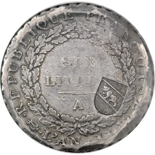 Obverse lettering REPUBLIQUE FRANÇOISE SIX LIVRES. A ·L`AN II·
