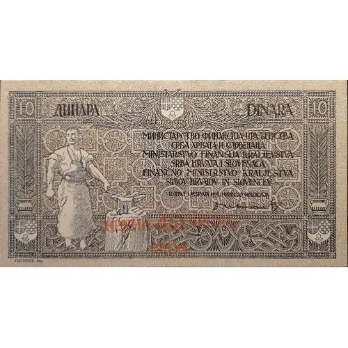 | Надписи лицевой стороны | ДИНАРА DINARA МИНИСТАРСТВО ФИНАНСИЈА КРАЉЕВСТВА СРБА ХРВТА И СЛОВЕНАЦА MINISTARSTVO FINANSIJA KRALJEVSTVA SRBA HRVATA I SLOVENACA FINANČNO MINISTRSTVO KRALJESTVA SRBOV HRVATOV IN SLOVENCEV БЕОГРAД 1 ФЕБРУАРА 1919 МИНИСАР ФИНАНСИЈА КРУНА 40 KRUNA KRON M.Cl. Crnčić fec. (Translation: with black ink DINARS DINARS MINISTRY OF FINANCE OF THE KINGDOM SERBIAN CROATS AND SLOVENES (X3) BELGRADE FEBRUARY 1, 1919 MINISTER OF FINANCE red overprint KRUNA 40 KRUNA KRON) |