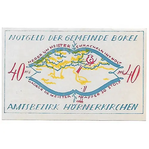 NOTGELD DER GEMEINDE BOKEL 40 PFG AMTSBEZIRK HORNERKIRCHEN (Translation: Notgeld of the community Bokel 40 Pfennig Official District Hornerkirchen) |