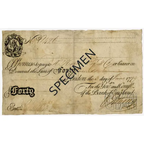 | Obverse lettering | 1779 I Promise to pay to_ or Bearer on Demand the Sum of FORTY Pounds London on the 3 day of June 1779 For the Govr and Compa of the Bank of England £FORTY Ent.d |
