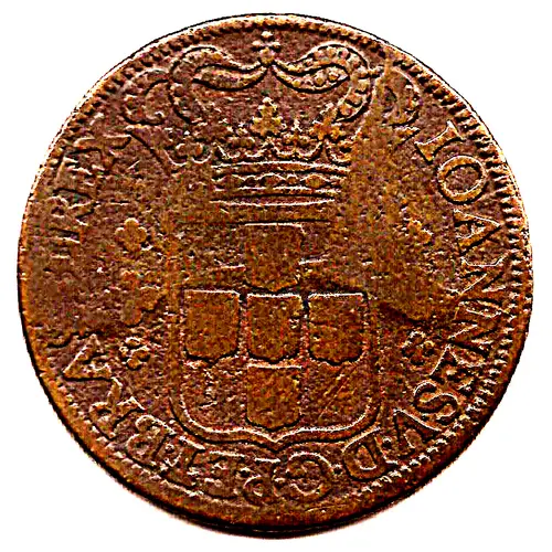 IOANNES.V.D.G.P.ET.BRASIL REX (Translation: IOANNES QUINTUS DEI GRATIA PORTUGALIÆ ET BRASILIÆ REX João V, by the Grace of God, King of Portugal and Brazil.) |