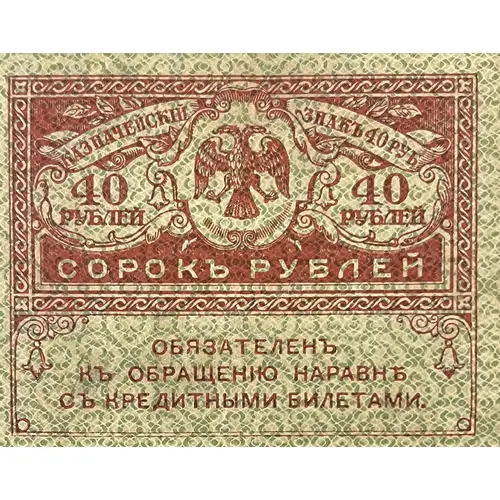 КАЗНАЧЕЙСКІЙ ЗНАКЪ 40 РУБ 40 РУБЛЕЙ СОРОКЪ РУБЛЕЙ ОБЯЗАТЕЛЕНЪ КЪ ОБРАЩЕНІЮ НАРАВНѢ СЪ КРЕДИТНЫМИ БИЛЕТАМИ. |