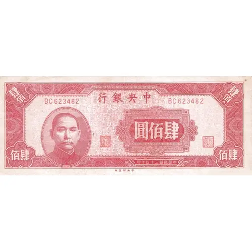 | Obverse lettering | 行銀央中 圓佰肆 印年四十三國民華中 (Translation: Central Bank of China Four Hundred Yuan The 34th year of the Republic) |