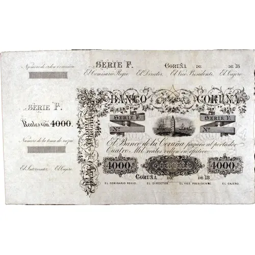 | Obverse lettering | BANCO DE LA CORUÑA El Banco de la Coruña pagará al portador Cuatro Mil reales vellon en efectivo 4000 r/s CORUÑA 4000 r/s CORUÑA ... DE ... DE 18... EL COMISARIO REGIO / EL DIRECTOR / EL VICEPRESIDENTE / EL CAJERO (Translation: Bank of A Coruña The Banco de la Coruña will pay the bearer Four Thousand reales vellon in cash 4000 r/s Coruña 4000 r/s Coruña... of... of 18... The Royal Commissioner / The Director / The Vice President / The Cashier) |