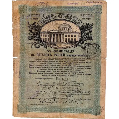 Black on blue underprint. At the top center, oval frame depicts the Tauride Palace (seat of the State Duma), flanked by laurel branches. Directly beneath the vignette, bold text, with several paragraphs of smaller text filling the central area below, followed by a cluster of signatures. The serial number is printed twice—once at the upper left and again at the upper right. Framed by intricate guilloche frame with square corner ornaments. At least two stamps; round ОГБ (Отделения Государственного Банка/Office of the State Bank) and rectangular one with netting. |