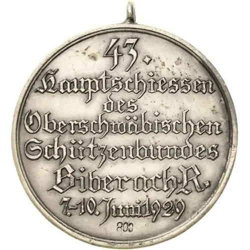 | Ön yüz lejandı | 43. Hauptschiessen des Oberschwäbischen Schützenbundes Biberach R. 7.-10. Juni 1929 800 |