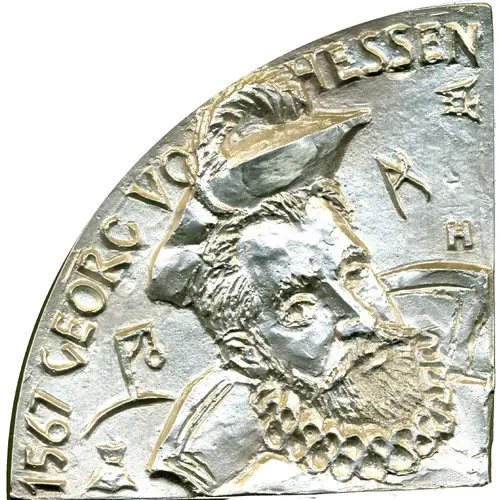 Portrait of Georg von Hessen with some details representing his regency (gallows, circle, moneybag), Initials of artist |