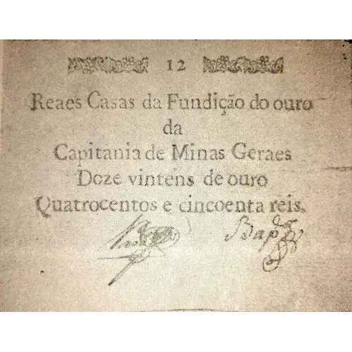 12 Reaes Casas da Fundição do ouro da Capitania de Minas Geraes Doze vintens de ouro Quatrocentos e cincoenta reis. (Translation: 12 Royal Gold Foundry Houses of the Captaincy of Minas Gerais Twelve gold vinténs Four hundred and fifty reis.) |