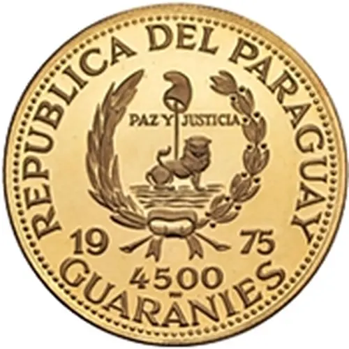 | Legenda del dritto | REPUBLICA DEL PARAGUAY PAZ Y JUSTICIA 19 75 4500 GUARANIES (Translation: Republic of Paraguay Peace and Justice 19 75 4500 Guaranies) |