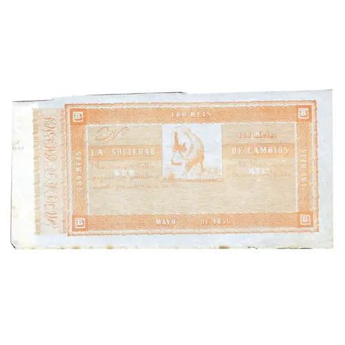 (Translation: Exchange Society 480 REIS The Exchange Society reckons this note for 480 Reis, each one, payable to bearer, and at sight, in 32 equal notes for one gold ounce. May, 1856)