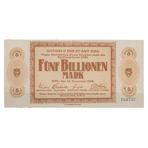 | نوشتههای روی اسکناس | NOTGELD DER STADT KIEL FÜNF BILLIONEN MARK KIEL, den 15. November 1923. Dieser Scheinverliert seine Gültigkeit innerhalb eines Monats nach Aufruf. |
