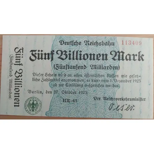Obverse lettering Deutsche Reichsbahn Fünf Billionen Mark (Fünftausend Millarden) Dieser Schein wird an allen öffentlichen Kassen wie gesets- liche Zahlmittel angenommen; er kann vom 1. Dezember 1923 ab zur Einlösung aufgerufen werden. Berlin, ven 27. Oktober 1923 Der Reichsverkehrsminister Oeser