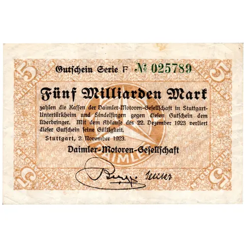 Obverse lettering Fünf Milliarden Mark zahlen die Kassen der Daimler-Motoren-Gesellschaft in Stuttgart-Untertürkheim und Sindelfingen gegen diesen Gutschein dem Überbringer. Mit dem Ablaufe des 22. Dezember 1923 verliert dieser Schein seine Gültigkeit. Stuttgart, 2. November 1923 Daimler-Motoren-Gesellschaft