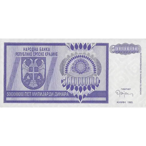 НАРОДНА БАНКА РЕПУБЛИКЕ СРПСКЕ КРАЈИНЕ 5 000 000 000 ПЕТ MИЛИЈАРДИ ДИНАРА ГУВЕРНЕР КНИН 1993. ФАЛСИФИКОВАЊЕ СЕ КАЖЊАВА ПО ЗАКОНУ (Translation: NATIONAL BANK REPUBLIC OF SERBIAN KRAJINA 5 000 000 000 FIVE BILLION DINARS GOVERNOR KNIN 1993. FORGERY IS PUNISHED BY LAW) |
