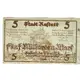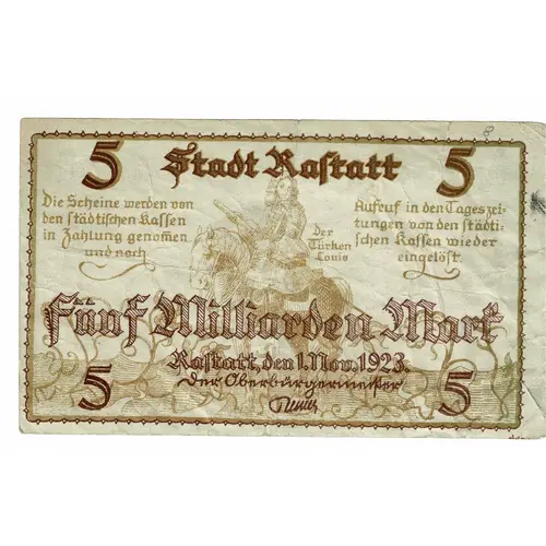 5 STADT RASTATT 5 DER TÜRKENLOUIS DIE SCHEINE WERDEN VON DEN STÄDTISCHEN KASSEN IN ZAHLUNG GENOMMEN UND NACH AUFRUF IN DEN TAGESZEITUNGEN VON DEN STÄDTISCHEN KASSEN WIEDER EINGEKLÖST FÜNF MILLIARDEN MARK RASTATT, DEN 1.NOV.1923 DER OBERBÜRGERMEISTER (Translation: 5 CITY RASTATT 5 THE TURKEN LOUIS THE NOTES ARE ACCEPTED IN PAYMENT BY THE MUNICIPAL CASH REGISTERS AND AFTER CALL IN THE DAILY NEWSPAPERS FROM THE MUNICIPAL TICKETS AGAIN REDEEMED FIVE BILLION MARKS RASTATT, NOV. 1, 1923 THE LORD MAYOR SIGNATURE: AUGUST RENNER) |