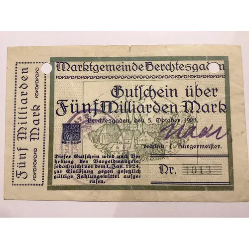 Fünf Milliarden Mark Marktgemeinde Berchtesgaden Gutschein über Fünf Milliarden Mark Berchtesgaden,den 5.Oktober 1923. rechtsk.Bürgermeister Dieser Gutschein wird nach Behebung des Bargelmangels jedoch nicht vor dem 1.Jan.1924 zur Einlösung gegen gesetzlich gültige Zahlungsmittel aufgerufen. |