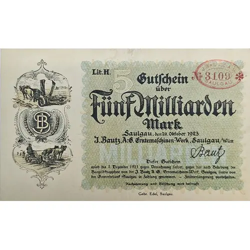 | Obverse lettering | Gutschein über Fünf Milliarden Mark Saulgau, den 20. Oktober 1923. J. Bautz, A.-G. Erntemaschinen-Werk, Saulgau/Württ. Dieser Gutschein wird bis 1. Dezember 1923 gegen Verrechnung sofort, gegen bar nach Behebung der Bargeldknappheit von der J. Bautz A.-G., Erntemaschinen-Werk, Saulgau, sowie von der Gewerbebank Saulgau in Zahlung genommen. - Fristverlängerung vorbehalten. |