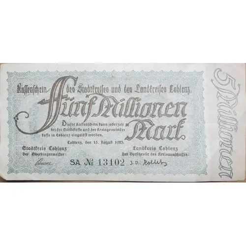 Kaffenschein des Stadtfreises und des Landfreises Coblenz Fünf Millionen Mark Dieser Kassenschein kann jederzeit bei der Stadtkasse und der Kreisgemeindekasse in Coblenz eingeldst werden Coblenz, den 15. August 1923 Stadfreis Coblenz der Oberburgermeister Landfreis Coblenz der Vorstßende des kreisauschusses (Translation: Ticket of the city and country of Coblenz Five Million Mark This ticket can be redeemed at any time at the city and district coffers in Coblenz Stadtfreis Coblenz the Lord Mayor Landfreis Coblenz, the chairman of the district committee) |