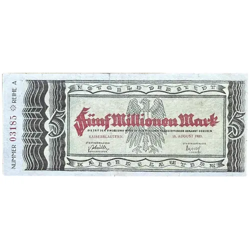 NOTGELD DER STADT Fünf Millionen Mark Die Zeit der Einlösung wird den Vorschriften gemäß bekannt gegeben Kaiserslautern 15. August 1923 Nummer: 03185 Reihe: A STADTVERWALTUNG Müller, Bürgermeister STADTHAUPTKASSE Kunz, Finanzrat Kaiserslautern (Translation: `Five Million Marks` `The time for redemption will be announced according to the regulations.` Kaiserslautern August 15, 1923 Number: 03185 Series: A City Administration Müller, Mayor Main City Treasury Kunz, Financial Officer) |