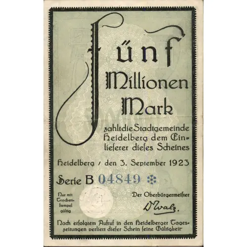 | Légende de l’avers | Fünf Millionen Mark zahlt die Stadtgemeinde Heidelberg dem Einlieferer dieses Scheins Heidelberg / den 3. September 1923 |