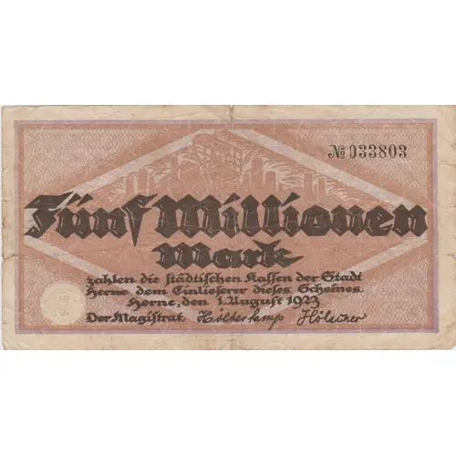 | Obverse lettering | Fünf Millionen Mark zahlen die städtischen Kassen der Stadt Herne dem Einlieferer dieses Scheines. Herne, den 1. August 1923 Der Magistrat |
