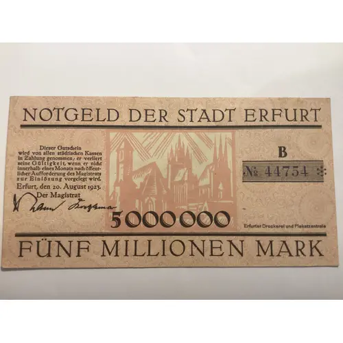 | Legenda awersu | NOTGELD DER STADT ERFURT 5 000 000 FÜNF f MILLIONEN MARK Dieser Gutschein wird von allen städtischen Kassen in Zahlung genommen,er verliert seine Gültigkeit,wenn er nicht innerhalb eines Monats nach offentlicher Aufforderung des Magistrats zur Einlösung vorgelegt wird Erfurt,den 20.August 1923 Der Magistrat |