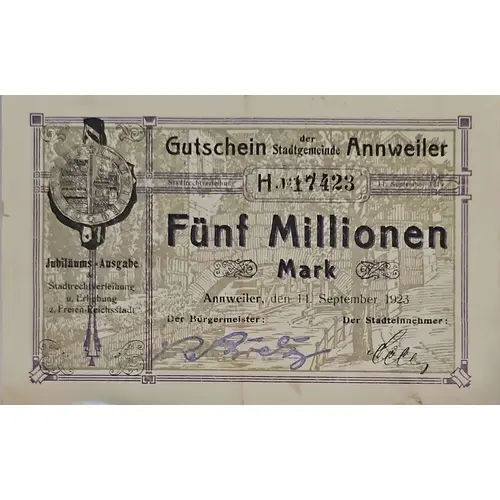 Gutschein der Stadtgemeinde Annweiler Stadtrechtverleihung H.No. 17423 14 September 1219 Funf Millionen Mark Jubilaums - Ausgabe der Stadtrechtverleihung u, Erliebung z. Freien-Reichsstadt Annweiler, den 14. September 1923 Der Burgermeister Der Stadteinnehmer (Translation: Voucher from the municipality of Annweiler City rights award H.No. 17423 September 14, 1219 Five million marks Anniversary edition the Granting of city rights u, love e.g. Free Imperial City Annweiler, September 14, 1923 The Mayor The City Collector) |