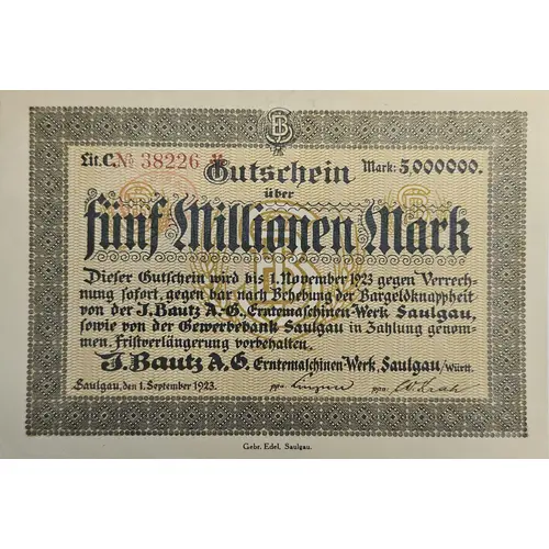 | Obverse lettering | Gutschein über fünf Millionen Mark Dieser Gutschein wird bis 1. November 1923 gegen Verrechnung sofort, gegen bar nach Behebung der Bargeldknappheit von der J. Bautz A.-G., Erntemaschinen-Werk Saulgau, sowie von der Gewerbebank Saulgau in Zahlung genommen. Fristverlängerung vorbehalten. J. Bautz A. G. Erntemaschinen-Werk, Saulgau/Württ. Saulgau, den 1. September 1923 |
