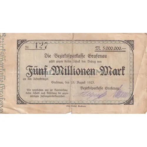 | Chữ khắc mặt trước | Die Bezirtsspartasse Grafenau zahlt gegen diefen Sched den Betrag von Funf Millionen Mark Grafenau, den 25 August 1923 |
