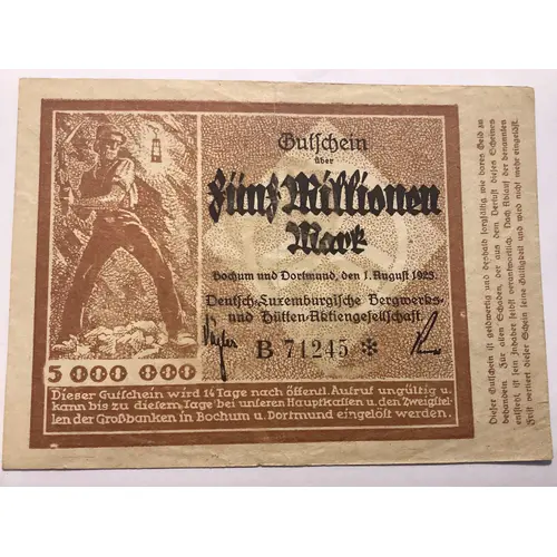 Gutschein über FÜNF MILLIONEN MARK Bochum und Dortmund,den 1.August 1923 Deutsch-Luxemburgische Bergwerks und Hütten-Aktiengesellschaft 5 000 000 Dieser Gutschein wird 14 Tage nach öffentl.Aufruf ungültig u.kann bis zu diesem Tage bei unseren Hauptkassen u.den Zweigstellen der GroßAnken in Bochum u.Dortmund eingelöst werden. Dieser Gutschein ist geldwertig und deshalb Sorgfältig wie bares Geld zu behandeln.Für allen Schaden der aus dem Verlust dieses Scheines entsteht.ist fein Inhaber selbst verantwortlich.Nach Ablauf der benannten Frist verliert dieser Schein feine Gültigkeit und wird nicht mehr eingelöst. |