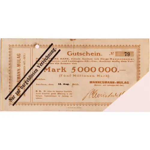 Die DEUTSCHE BANK, Filiale Aachen (als Bürge Mannesmann- Mulag, Motoren- und Lastwagen-Akt.-Ges., Aachen) wolle dem Vor- zeiger dieses die Summe von Mark 5 000 0000 .- (Fünf Millionen Mark) zahlen. Aachen, den 14. Aug. 1923 N.B. Wir bitten die Aachener Geschäfte diesen Gutschein gemäß Mitteilung in den hiesigen Tageszeitungen in Zahlung zu nehmen On the lower right corner: MANNESMANN-MULAG (Motoren- und Lastwagen-Akt.-Ges.) Signature in the left quadrangle: MANNESMANN-MULAG (MOTOREN UND LASTWAGEN-AKT.-GES.) Left side, crossed from bottom to top Nur zur bargeldlosen Verrechnung |