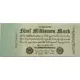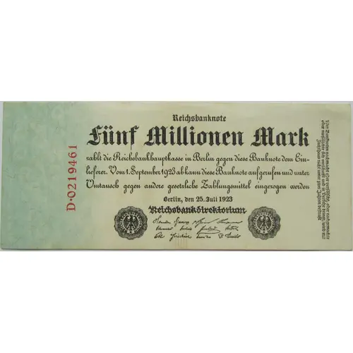 Reichbanknote Five Millionen Mark zahlt die Reichsbankhauptkasse in Berlin gegen diese Banknote dem Einlieferer. Vom 1. Oktober1923 ab kann diese Banknote aufgerufen und unter Umtausch gegen andere gesetzliche Zahlungsmittel eingezogen werden Berlin, den 22. August 1923 Reichsbankdirektorium (along the left) Wer Banknoten nachmacht oder verfälscht, oder nachgemachte oder verfälschte sich verschafft und in verkehr bringt, wird mit Zuchthaus nicht unter zwei Jahren bestraft (Translation: The Reichsbank Main Branch in Berlin will pay the holder of this note five million marks. Beginning October 1st 1923, this note may be recalled and collected in exchange for other legal tender Berlin, the 22nd of August, 1923 Reichsbank Directorate (along the left) Whosoever copies or falsifies banknotes or acquires and puts copied or falsified banknotes into circulation will be punished with no less than two years of prison time.) |