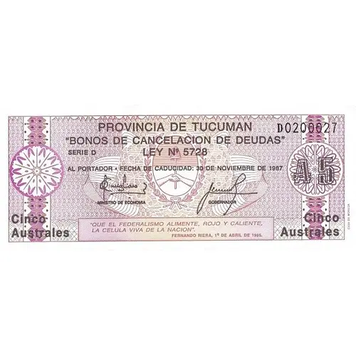 PROVINCIA DE TUCUMAN `BONOS DE CANCELACION DE DEUDAS` SERIE D LEY N° 5728 AL PORTADOR - FECHA DE CADUCIDAD: 30 DE NOVIEMBRE DE 1987 Cinco Australes `QUE EL FEDERALISMO ALIMENTE, ROJO Y CALIENTE, LA CELULA VIVA DE LA NACION`. FERNANDO RIERA, 1° DE ABRIL DE 1985. Cinco Australes (Translation: PROVINCE OF TUCUMAN `DEBT CANCELLATION BONDS` SERIES D LAW N ° 5728 TO THE CARRIER - EXPIRY DATE: NOVEMBER 30, 1987 Five Australes `MAY FEDERALISM FEED, RED AND HOT, THE LIVING CELL OF THE NATION`. FERNANDO RIERA, APRIL 1, 1985. Five Australes) |