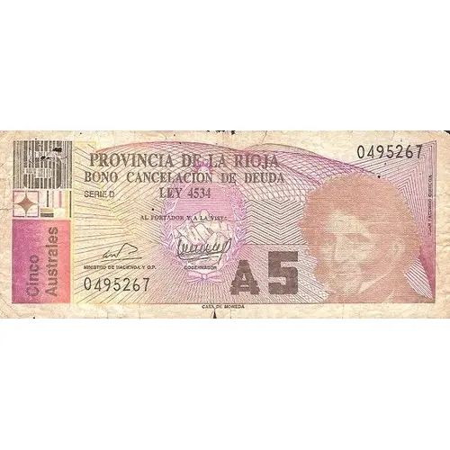 (Translation: La Rioja Province Debt Cancellation Bond Law 4534 To the bearer in sight Five austral)