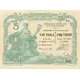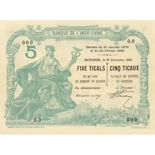 | Obverse lettering | BANQUE DE L`INDO-CHINE 5 Décrets du 21 Janvier 1875 et du 20 Février 1888 BANGKOK, le 22 Décembre 1898. FIVE TICALS TO BE PAID ON DEMAND TO BEARER CINQ TICAUX PAYABLE EN ESPÈCES AU PORTEUR Un Administrateur : Le Directeur : DANIEL DEPUIS ET GEORGES DUVAL FEC LEVEILLE SC |