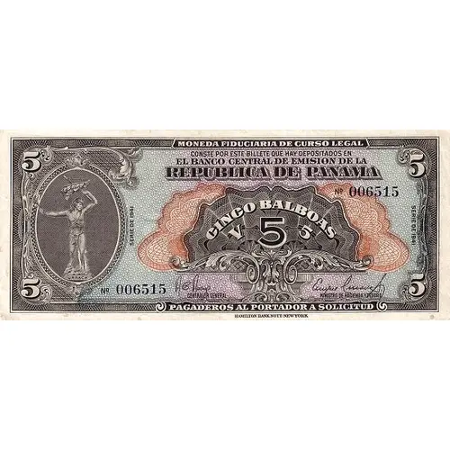 MONEDA FIDUCIARIA DE CURSO LEGAL CONSTE POR ESTE BILLETE QUE HAY DEPOSITADOS EN EL BANCO CENTRAL DE EMISION DE LA REPUBLICA DE PANAMA CINCO BALBOAS PAGADEROS AL PORTADOR A SOLICITUD |