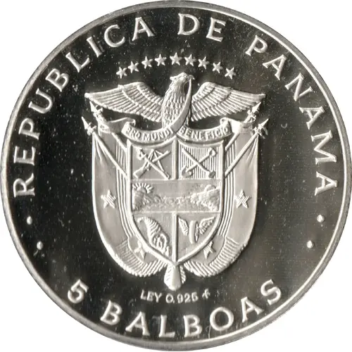 | Ön yüz lejandı | · · REPUBLICA DE PANAMA · · ********* PRO MUNDI BENEFICIO LEY 0.925 FM 5 BALBOAS (Translation: Republic of Panama For the Benefit of the World 0.925 Purity) |