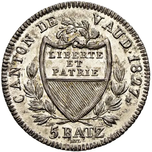 | Legenda do anverso | CANTON DE VAUD 1827 LIBERTE ET PATRIE 5. BATZ BEL |